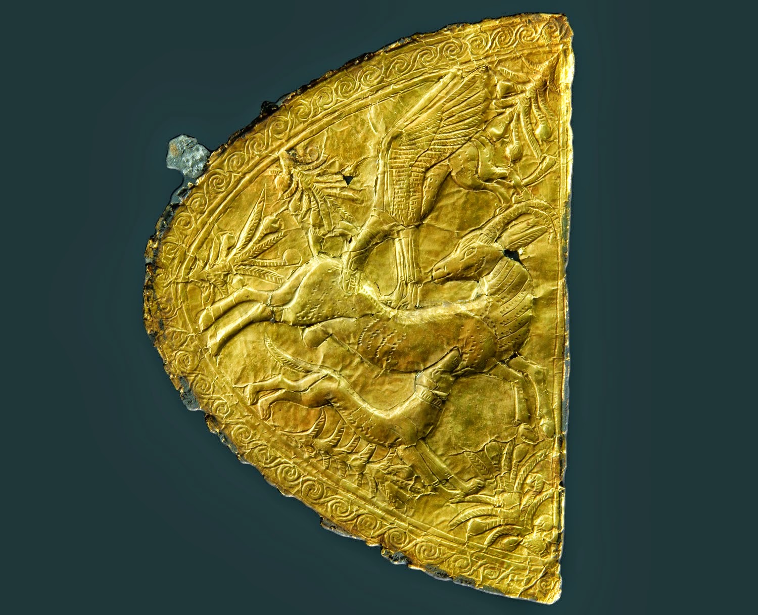 Gold-leaf decoration showing a hunting-scene (a dog and a griffin attacking an ibex) using motifs from levantine art [Credit:: Christian Eckmann]