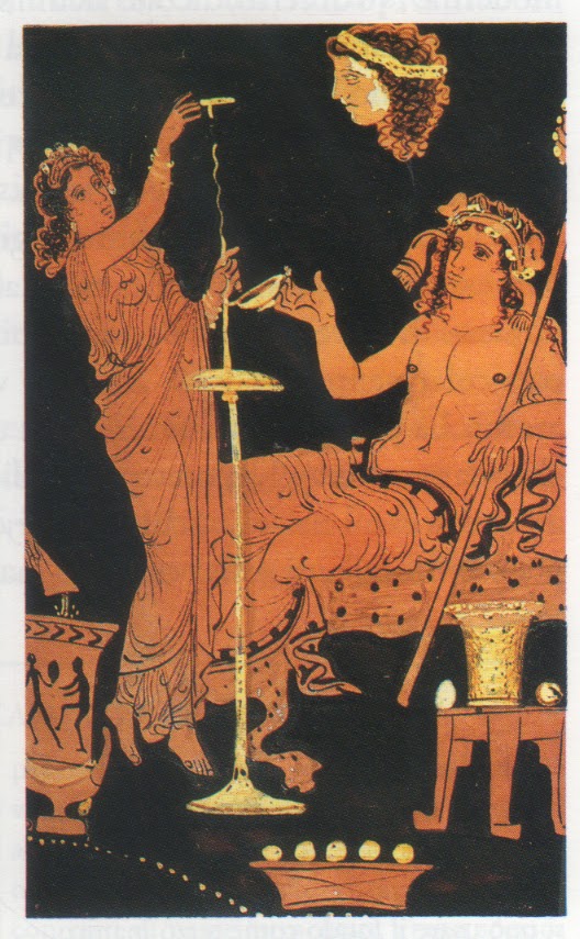 - Certamente, il gioco era reso più interessante dalla coreografie di giovani schiave - vestite solo di ghirlande di fiori, per non sporcare inutilmente gli abiti - che si chinavano a raccogliere il plastinix, si sporgevano in alto per rimetterlo a posto e poi s'avvicinavano agli intervenuti per rifornire nuovamente le coppe dei partecipanti, semisdraiati sui loro lettini...