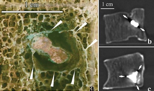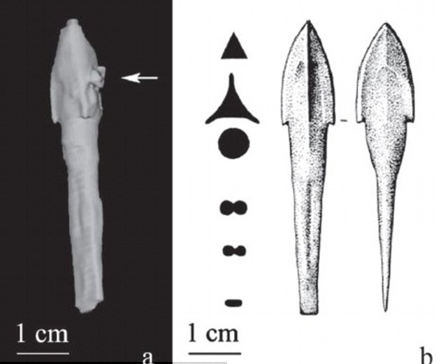 The researchers used CT scans to reconstruct how the arrowhead looks and found it appears to have been made with a pure form of copper and tin. They say it appears to have been a military grade arrow rather than one used for hunting [Credit: S. Tur et al., International Journal of Osteoarchaeology]