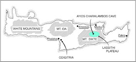 | Figura 1: Posizione della grotta Ayios Charalambos e delle Tombe a Tholos di Odigitria. |