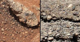 | A sinistra: i ciottoli marziani; a destra comuni ciottoli terrestri (vedi anche forto ingrandita nel testo inglese, sotto) |