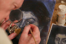 Each work is meticulously copied. Wood is cut to the exact dimensions, sanded and stained to stress the age of the work. A photocopy of the work is pasted onto the wood before being painted over to give the piece its deceiving authenticity. Watercolors are strikingly identical and the charcoal works, done with color pencil, are deceptively perfect.