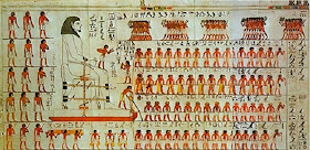 Wall painting from the tomb of Djehutihotep showing a large statue is being transported by sledge. A person standing on the front of the sledge wets the sand