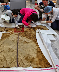 Urumqi, Xinjiang Autonomous Region Institute of Archaeology, documentation of a 1800-year-old silk dress from Niya [Credit: (c) Joy Zhou, Deutsches Archäologisches Institut]