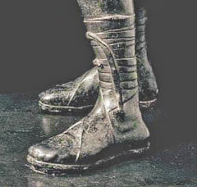 di una tunica bordata da una stretta banda. Il personaggio indossa dei calzari.