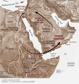 New research reveals a second, more southerly route through Arabia, where modern human populations lingered for some 50,000 years before migrating north to the Levant [Credit: National Geographic]
