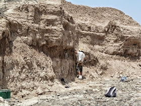 The site is several hours' drive on rough roads from the nearest town, located in a hot, dry landscape he said is reminiscent of Arizona and New Mexico. Lepre collected chunks of sediment from a series of depths and brought them back to Lamont-Doherty for analysis. He and Kent used a bandsaw to trim the samples into sugar cube-size blocks and inserted them into a magnetometer, which measured the polarity of tiny grains of the minerals hematite and magnetite contained in the sediment.