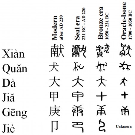 Ruskamp gives the following translation for the Albuquerque petroglyphs: “Geng (a date; the seventh Chinese Heavenly Stem); Jie (to kneel down in reverence); Da (great—referring to a superior); Quan (dog—the sacrificial animal); Xian (offering worship to deceased ancestors); and Da Jia (the name of the third king of the Shang dynasty).”