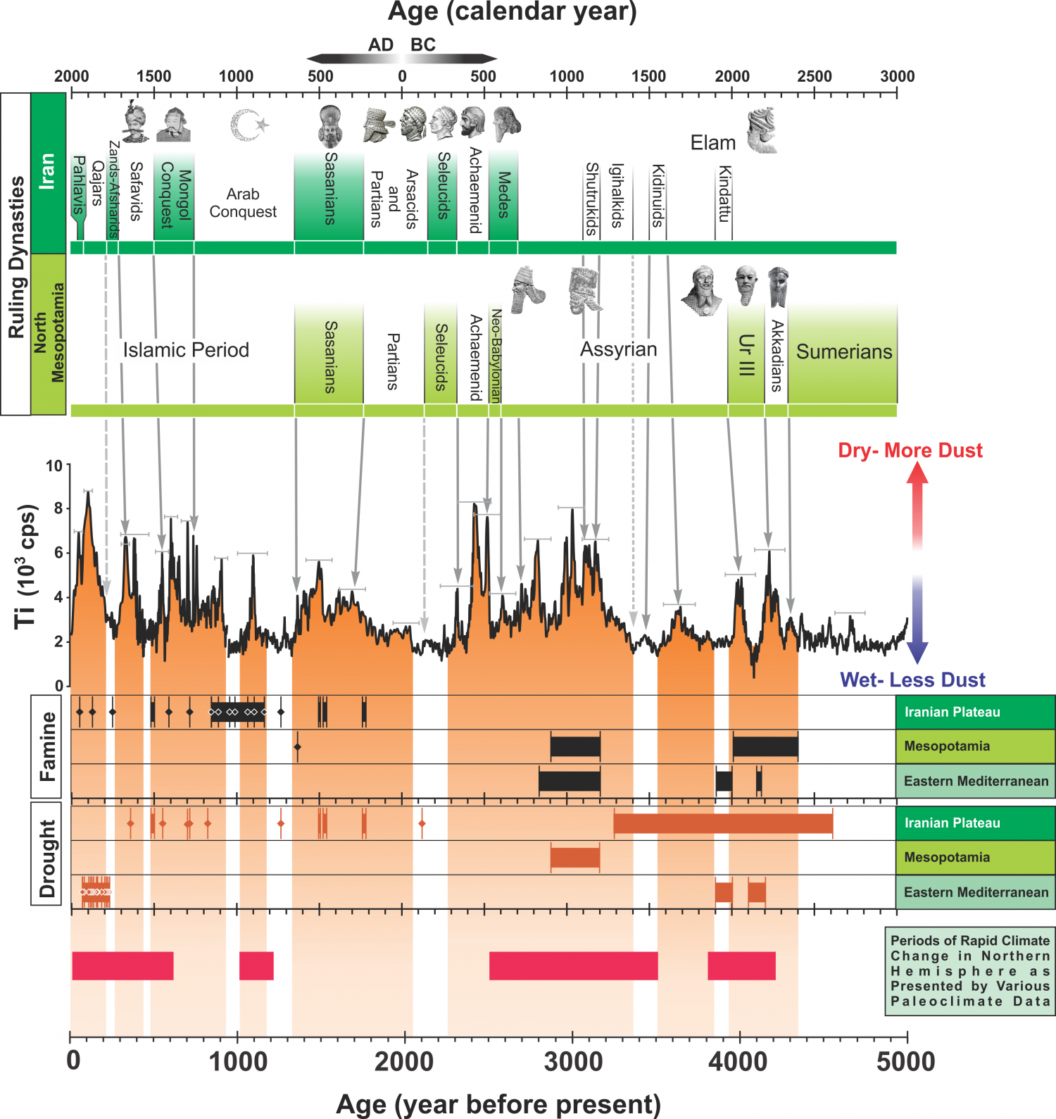 Transition between ruling dynasties (gray arrows) in Iran and North Mesopotamia coincides with the episodes of dry and dusty condition in the region (peaks in Ti intensities)